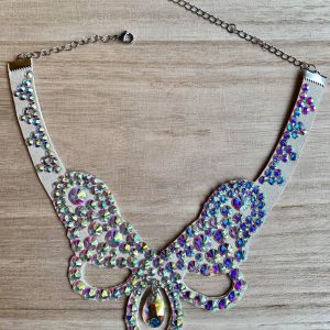 ☆しずく型を中心に軽やかに見えるようくり抜きを施したデザインのネックレスです。 衣装に合わせて、ネックレスの長さを調節できます。軽い印象になりすぎないよう、所々大きなストーンも散りばめました。 中央にはオーロラ色のしずく型ガラスストーンを揺れるように垂らしました。 表面の布は、質感の美しいフェイクスエードを使用しております。 裏面は汗が染み込みにくいよう、フェイクエナメルを張り合わせてあります。